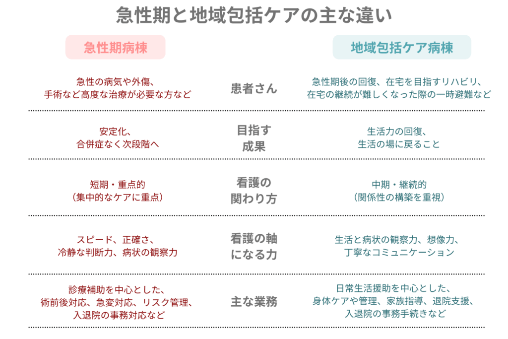 今回は、「急性期病棟」と「地域包括ケア病棟」の違いについて、看護という観点からお伝えしました。