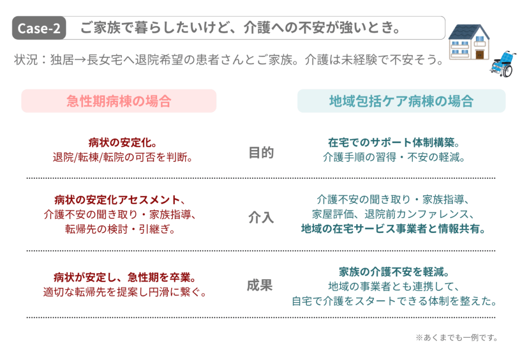 では、急性期病棟、地域包括ケア病棟に入院されている方のケースでそれぞれの違いを紐解いていきます。なお、ここで示す違いに優劣はなく、あくまでも役割の違いがあるだけです。急性期は危機からの安全確保と安定化、地域包括ケアは暮らしへの橋渡しというリレーで患者さんを支える、というそれぞれの役割があります。